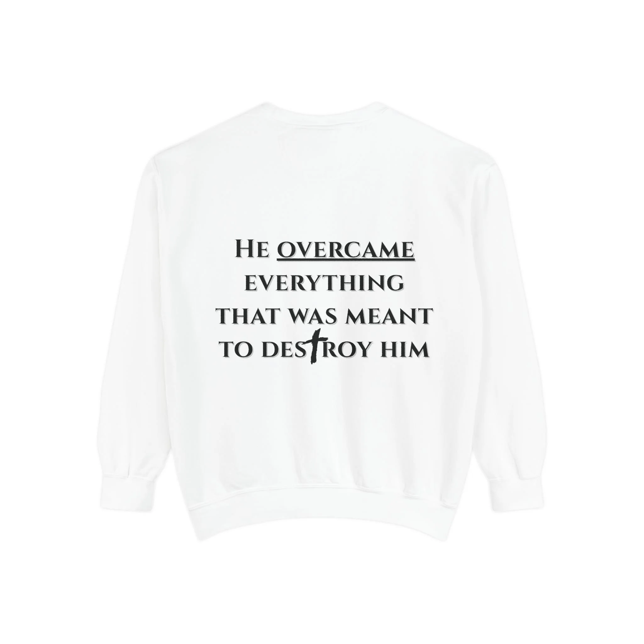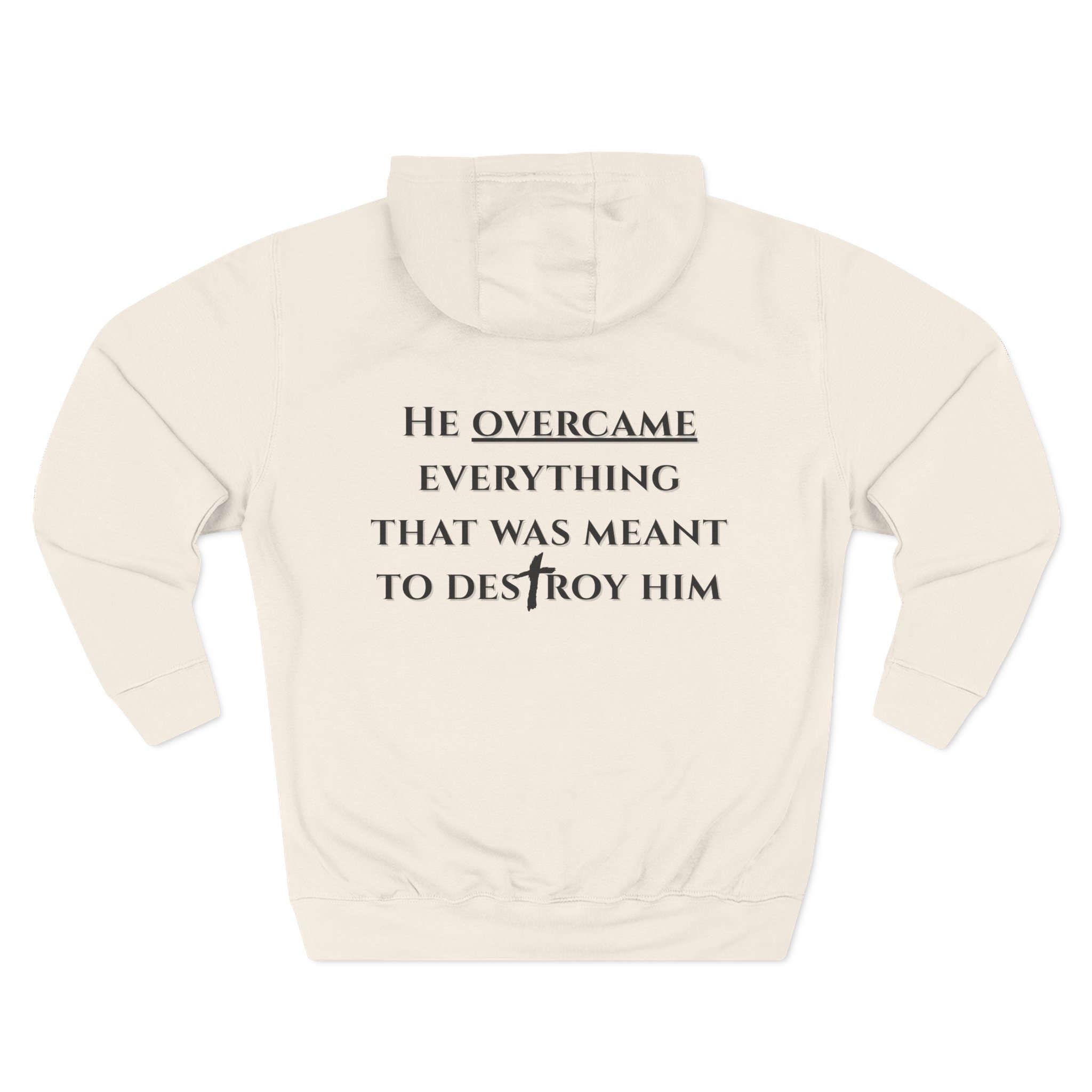 A comfortable, everyday hoodie created as a reminder of strength through every season. Featuring the statement “He overcame everything that was meant to destroy him,” this design reflects resilience, growth, and quiet confidence. Made with soft fleece and a brushed interior for warmth, it pairs a minimal front detail with a meaningful back design that speaks without shouting. Finished with a roomy kangaroo pocket and adjustable hood, it’s an effortless layer for coffee runs, studio days, late drives, and slow weekends.
