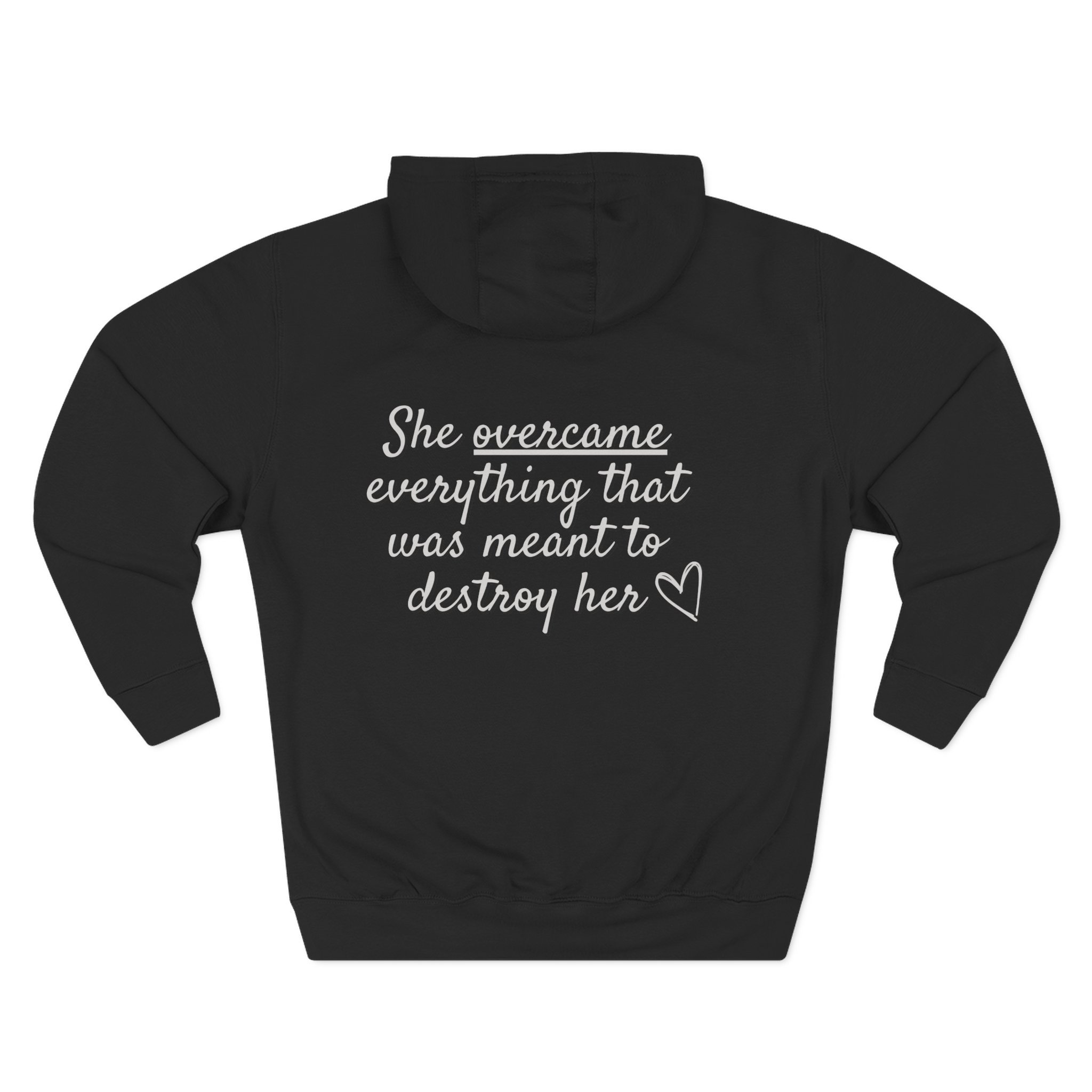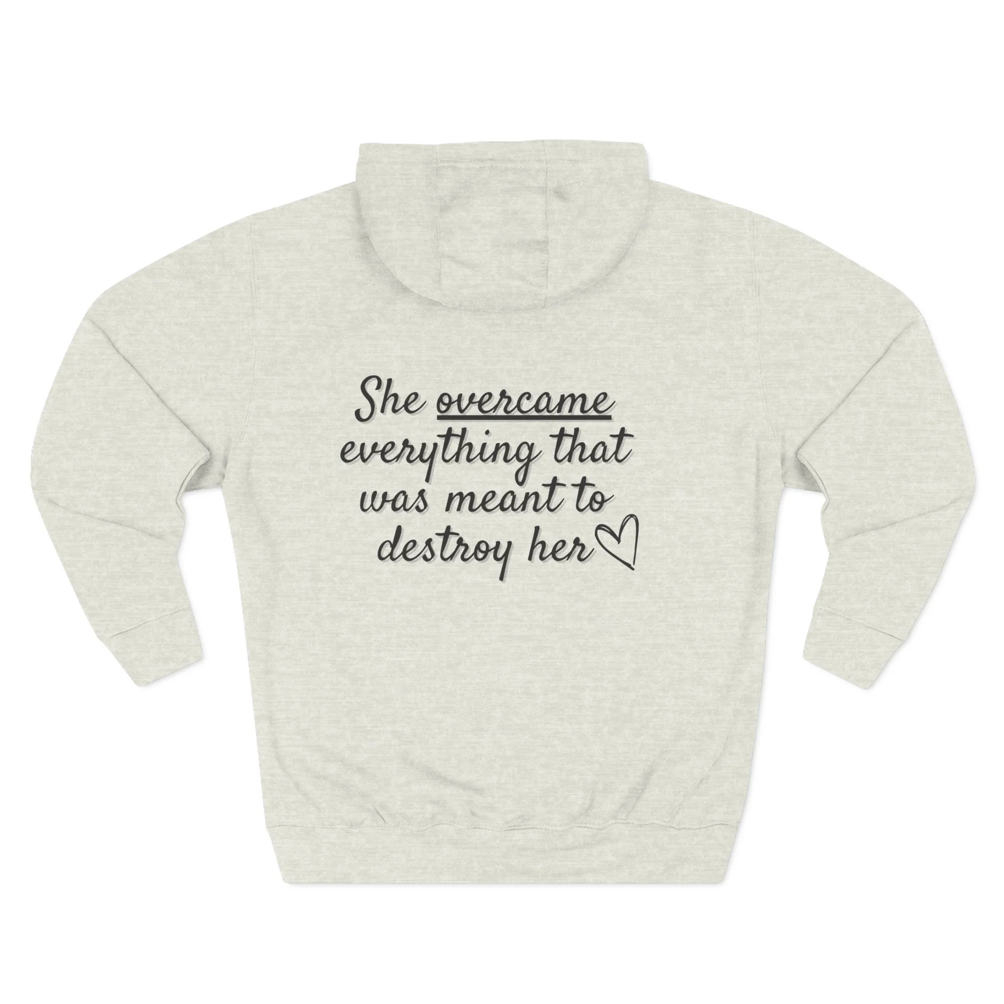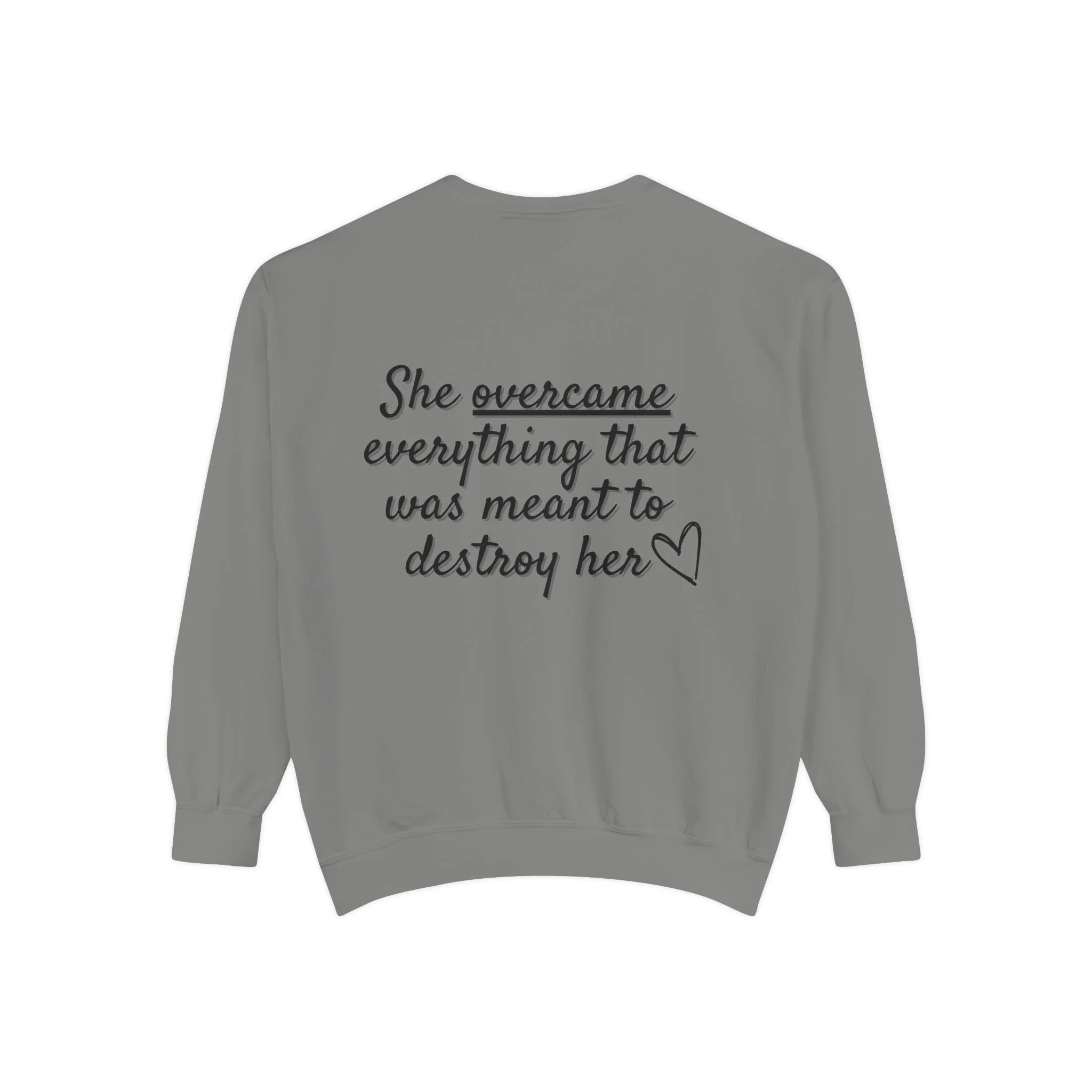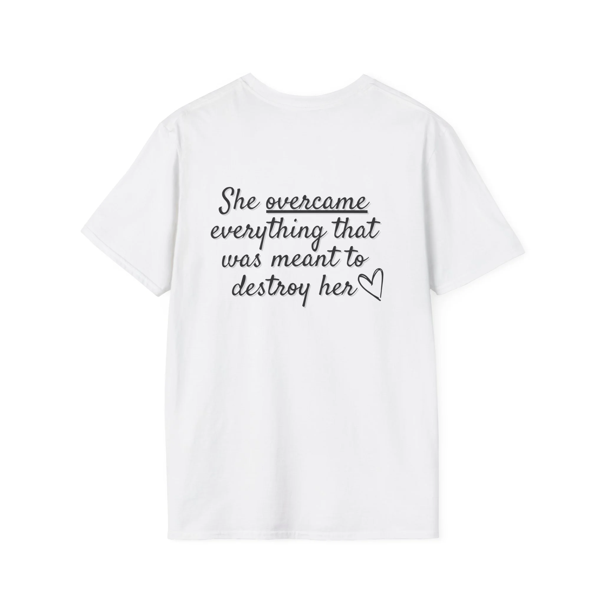 Lightweight, minimal, and quietly confident — this tee features the statement “She overcame everything that was meant to destroy her,” paired with a subtle wing motif symbolizing resilience, renewal, and forward movement. Made from soft ring-spun cotton, it sits comfortably against the skin, perfect for layering under a jacket on early mornings or wearing on its own for a calm, intentional look. Designed to blend effortlessly with neutral wardrobes and everyday routines, it’s a wearable reminder of strength carried with grace.